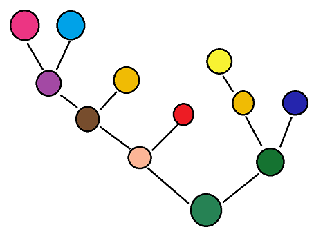 For design, while I was studying how colors mixed, I got the idea of setting a character or a scene's color palette as some sort of tree graph. Illustrated by the graph below, the general rule is that if two colors mixed a certain way, they'd merge into one color which would be their relative base, and the rule repeats. From this graph, it's not only a means of finding odd, but effective color schemes, but also a means of abstracting a character in a scene to one color. Ontop of that, I have wanted to push the coloring more towards a stained glass or enamel inspired appearance to try getting the sort of gravity I want. Even though there's more to practice, I am satisfied with the result, even if I'm not sure if it's feasible to spend hours on the color texturing that went on here for comic panels. It would be really neat though, if I'm able to find a means to speed up the process for fifty or so pages full pages of art. Regardless, the gravity intended is meant to serve the potency of Chimeric.